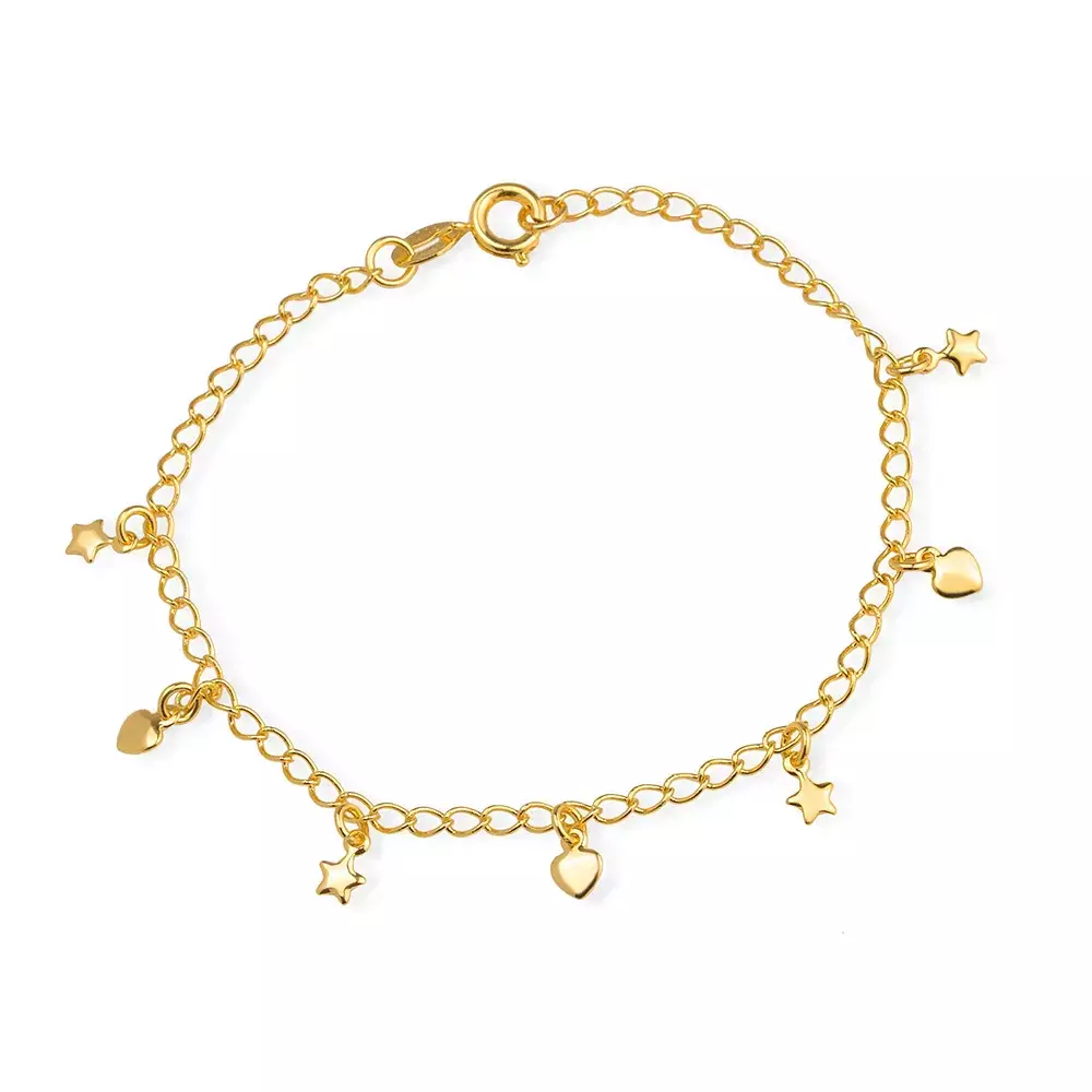 A Pulseira Dourada com Pingentes de Coração e Estrela é uma peça delicada e charmosa, perfeita para quem busca um toque sutil de elegância no dia a dia. Com 18 cm de comprimento, espessura de 0,3 cm e peso de 2g, oferece leveza e conforto no uso.